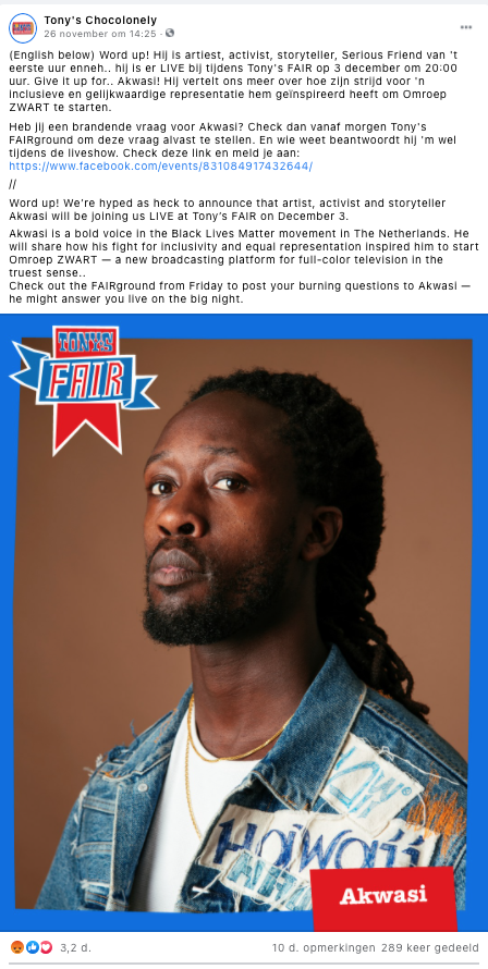 1. Tony’s Chocolonely deelt dit bericht op Facebook. Akwasi wordt aangekondigd als gast en mensen hebben ze mogelijkheid om hem een vraag te stellen in de liveshow.