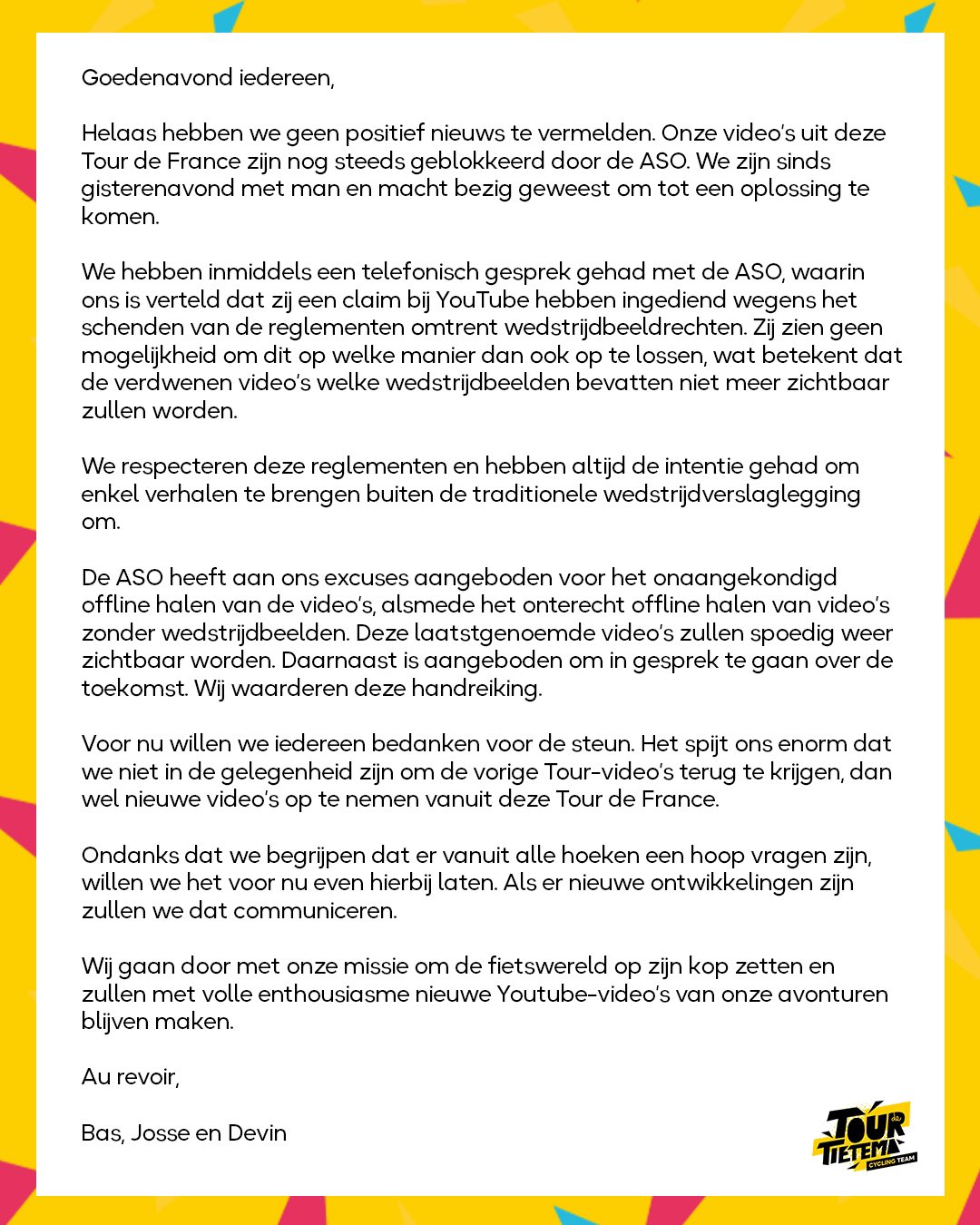 2. Deze week kwam Bas dus met zorgwekkend nieuws: al hun videos zijn offline gehaald door de Amaury Sport Organisation (kort: ASO). Het is de organisatie achter de Tour de France.