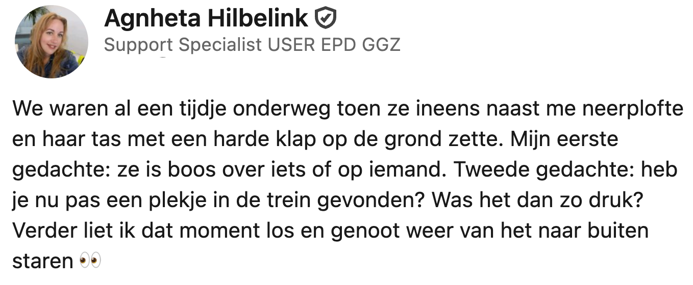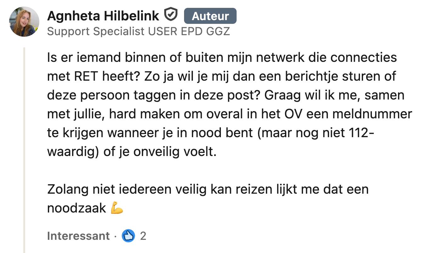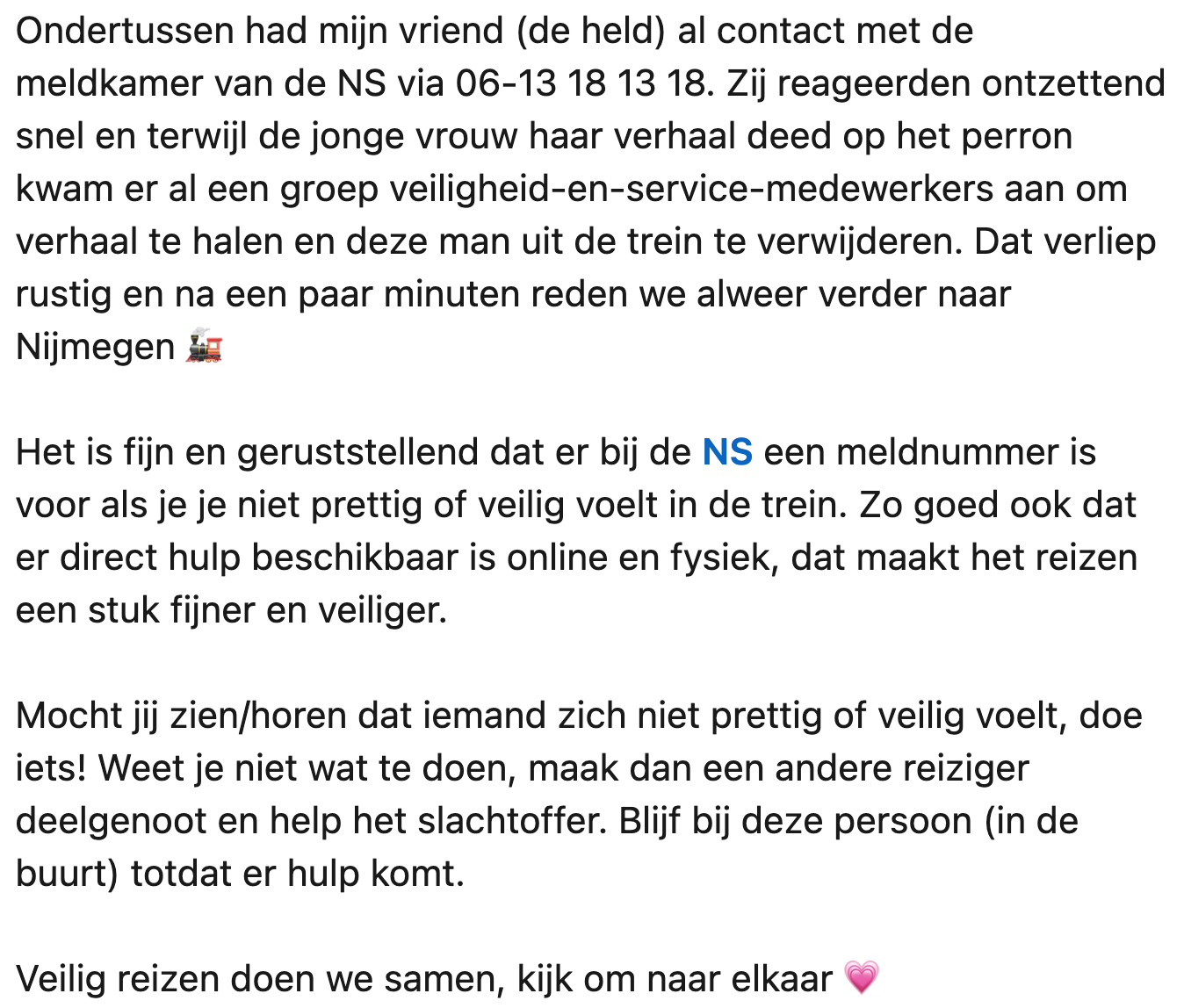 Iedereen zou op elk moment van de dag veilig met de trein moeten kunnen reizen, maar helaas is dat niet altijd het geval. Agnheta en haar vriend zien tijdens een rit dat een vrouwelijke medereiziger wordt lastiggevallen door een man en zich onveilig. Het koppel komt meteen in actie, en doet naderhand een belangrijke oproep op LinkedIn.