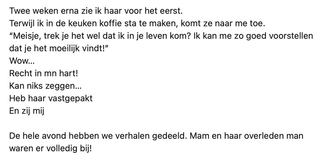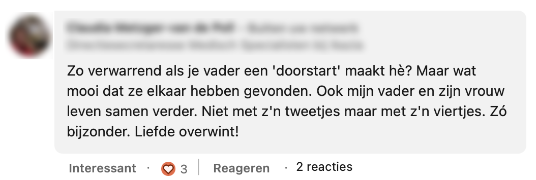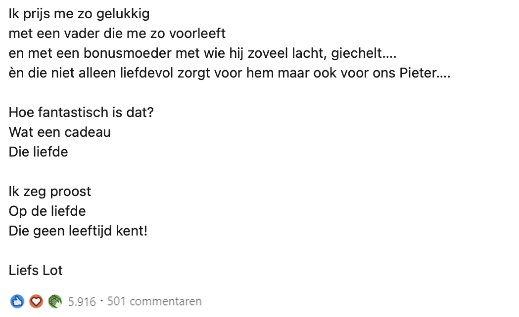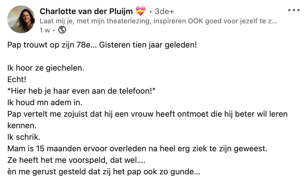 Charlotte deelt op LinkedIn een prachtig verhaal over haar vader en zijn nieuwe vrouw. Haar moeder was vijftien maanden geleden overleden toen haar vader een nieuwe vrouw ontmoette. Eerst had Charlotte hier moeite mee, maar al snel bleek dat dit een mooi avontuur zou worden. Dat haar vader 78 was toen hij opnieuw trouwde zegt dus dat leeftijd maar een getal is.