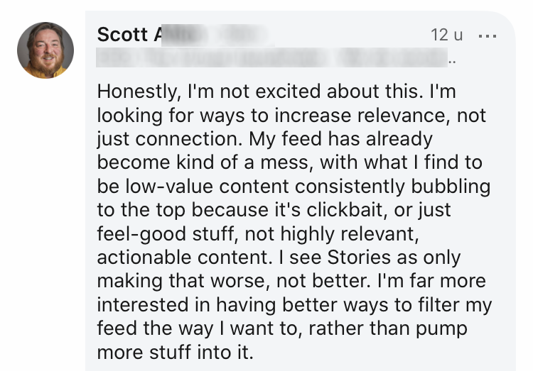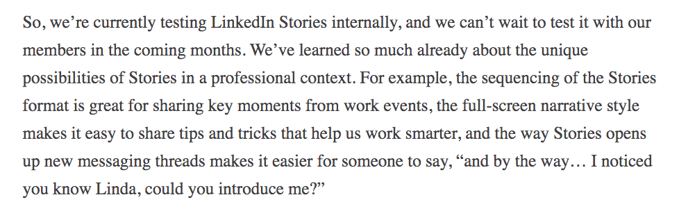 Pete Davies (head of content products bij LinkedIn) bevestigt dat ze bezig zijn met hun eigen versie van stories die hoogstwaarschijnlijk snel kan worden uitgerold. En nu er een generatie opgroeit met Stories, kan LinkedIn natuurlijk niet achterblijven.