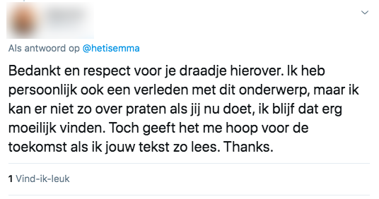 En ik wil jullie nog meegeven dat het best wel respectloos en ongewenst is om zomaar, uit het niets, te reageren op littekens van mensen. Zelfs als je intentie goed is, is het vervelend om er steeds mee geconfronteerd te worden. Zeker als je geen (goede) bekende bent.