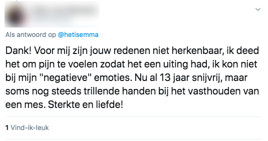 … En ik denk in het algemeen dat meer openheid over automutilatie, en bijvoorbeeld ook onderwijs erover op school, kan bijdragen aan de destigmatisering en het algemene begrip.