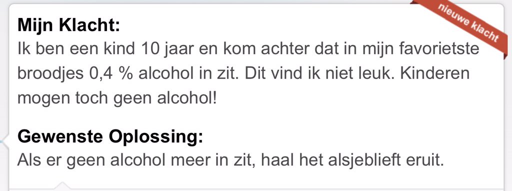 13. Deze jonge klager heeft op zich wél een punt. In zijn favorietste broodjes zit alcohol en dat wil hij helemaal niet. Logisch.