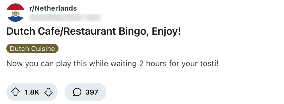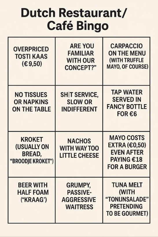 De zon schijnt, je hebt al een lange dag achter de rug en een gat in de hand: hét perfecte moment om te gaan terrassen. Maar zelfs als je heel de dag leuke dingen hebt meegemaakt, raak je uiteindelijk uitgepraat met je tafelgenoot. Gelukkig heeft deze Reddit-gebruiker daar de perfecte oplossing voor. Hij steekt de draak met typisch Nederlandse restaurants door er een bingokaart over te maken. En geloof ons: de kans dat je ‘BINGO!’ roept voordat de bitterballen worden geserveerd, is erg groot.