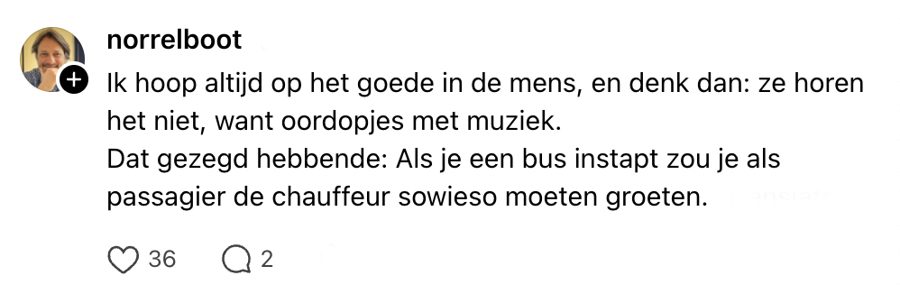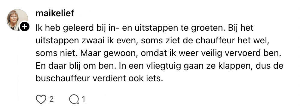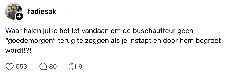 Buschauffeurs hebben heel wat te verduren tijdens een gemiddelde werkdag. Denk bijvoorbeeld aan het constante gepiep van mensen die inchecken, regelmatig lang in de file staan of het verwerken van de teleurstelling wanneer reizigers voor de zoveelste keer bij de achterdeuren instappen. Het minste wat jij dan kan doen is vriendelijk gedag zeggen tegen de buschauffeur wanneer je in- en uitstapt, maar in de praktijk gebeurt dat toch minder dan je zou denken. Fadi doet er op Threads een uitspraak over en dat maakt veel los bij andere Nederlanders.