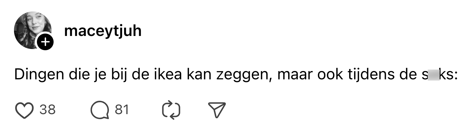 IKEA is dé winkel om meubels te scoren als je de boel weer eens lekker overhoop wil gooien. Wanneer je de slaapkamer onder handen wil nemen, ben je dan ook je hele zondagmiddag kwijt aan het testen van allerlei verschillende bedden, zodat je zo goed mogelijk kan slapen. Maar die bedden worden uiteindelijk ook voor heel andere doeleinden gebruikt. Macey vraagt via Threads naar uitspraken die je tijdens een rondje IKEA én in de slaapkamer kan zeggen en op de pikante reacties kan je bouwen.