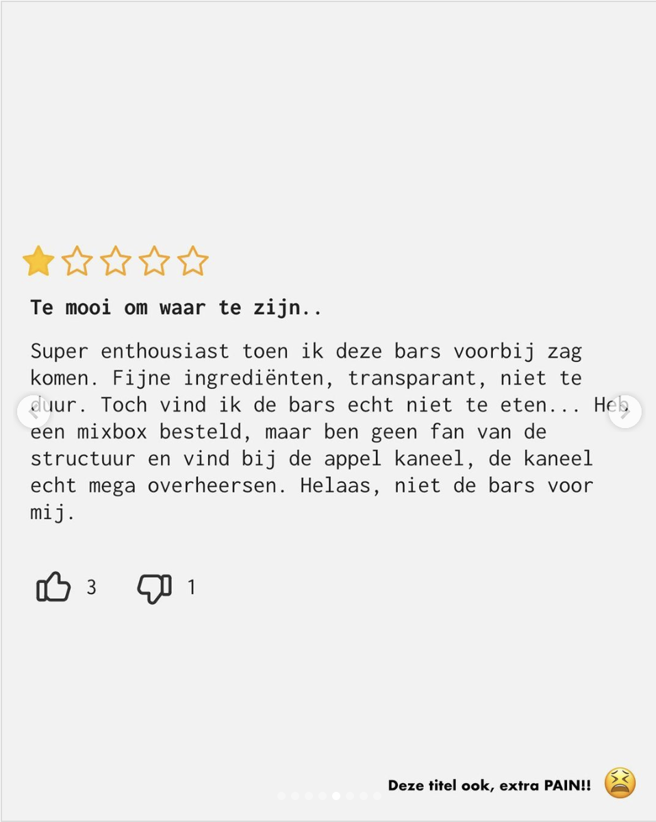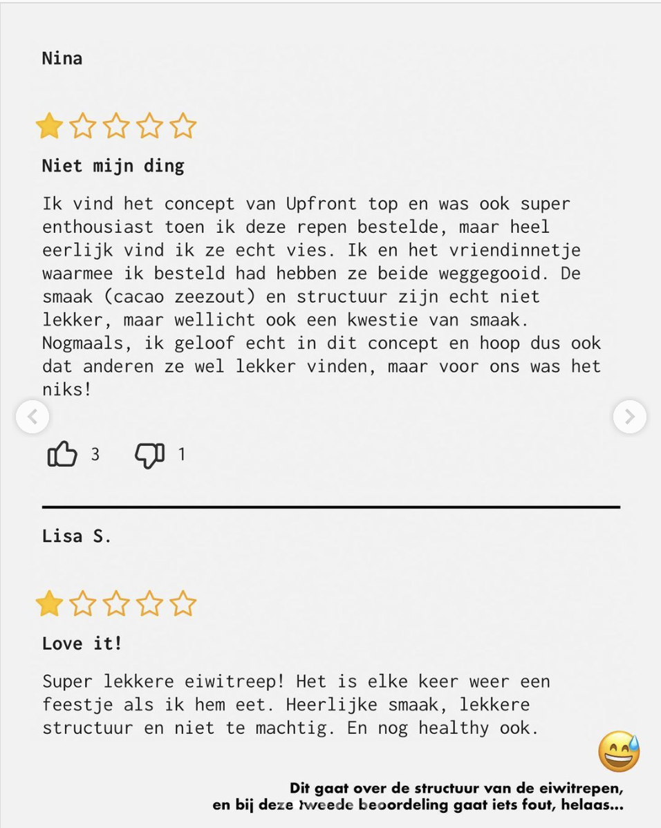 Upfront, een online voedingsplatform, deelt via Instagram een aantal van hun 1-ster reviews met de meest voorkomende klachten die ze over zichzelf hebben ontvangen. Ze zeggen deze reviews serieus te nemen en juist te gebruiken om hun producten nog beter te maken. Dit is natuurlijk heel erg verfrissend in een wereld waar bedrijven het het liefst alleen maar hun beste kant laten zien aan de consument.