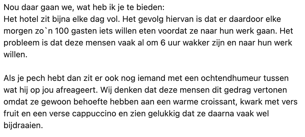 2. Dat valt te begrijpen, want zoals Dirk het omschrijft lijkt er inderdaad weinig aan (op het werken met croissants na, dan).