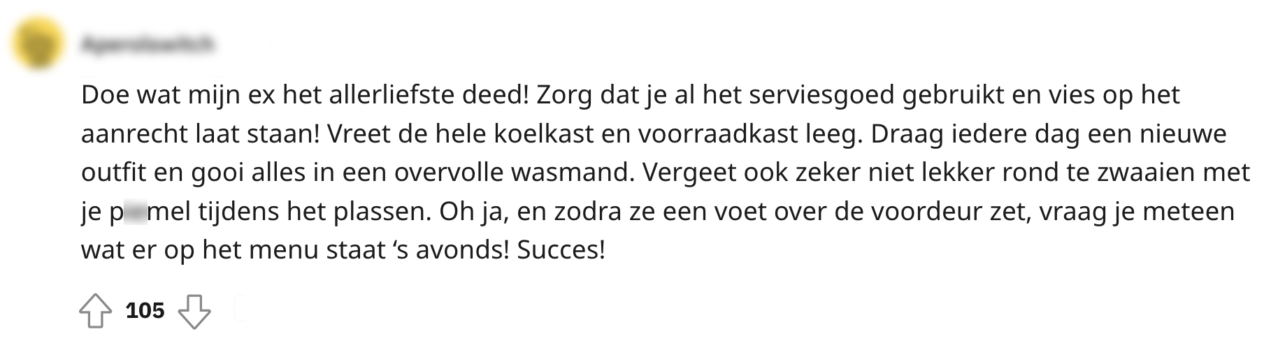 Wanneer jij en je partner altijd samen zijn en nog nét niet aan elkaar vast zijn gegroeid, kan het best gek zijn als diegene een hele week op vakantie gaat. Ineens heb je alle tijd van de wereld, maar wat ga je daar eigenlijk mee doen? Precies die vraag stelt een Reddit-gebruiker zichzelf. Gelukkig krijgt deze persoon direct een aantal geniale, lachwekkende en totáál niet relatie-verpestende tips.
