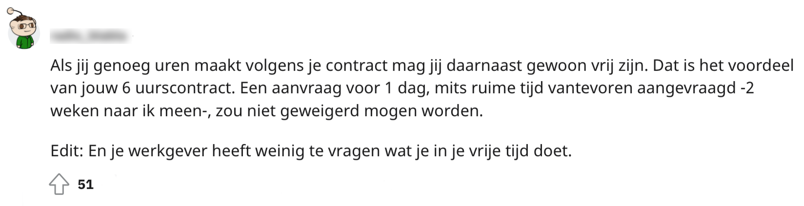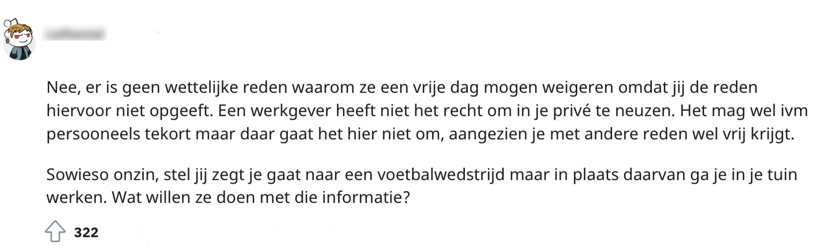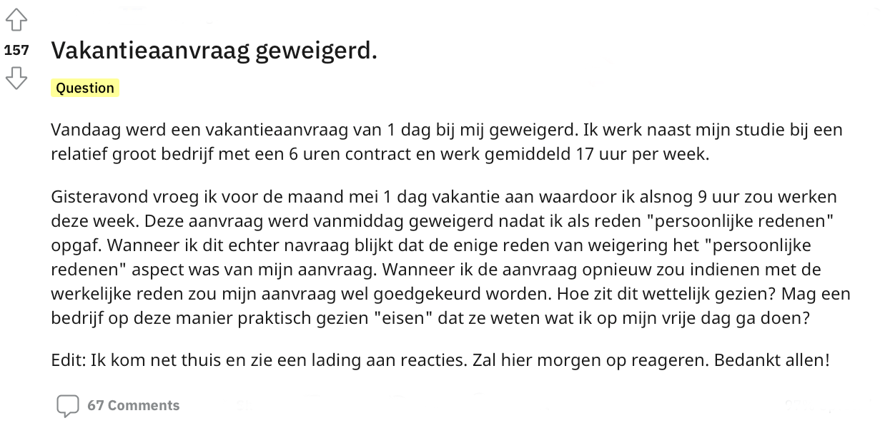 Als je een vaste- of bijbaan hebt moet je natuurlijk altijd rekening houden met je vrije dagen. Helaas krijgen de meeste werknemers maar een beperkt aantal dagen en is het altijd flink puzzelen. Op Reddit vertelt iemand dat een vakantieaanvraag geweigerd is door de werkgever. Dit omdat er niet was vermeld waar de vrije dag voor was. Ze vraagt zich af of het eigenlijk wel is toegestaan dat haar werkgever per se wil weten wat ze op deze ‘vrije dag’ zou gaan doen. Andere mensen schieten te hulp.
