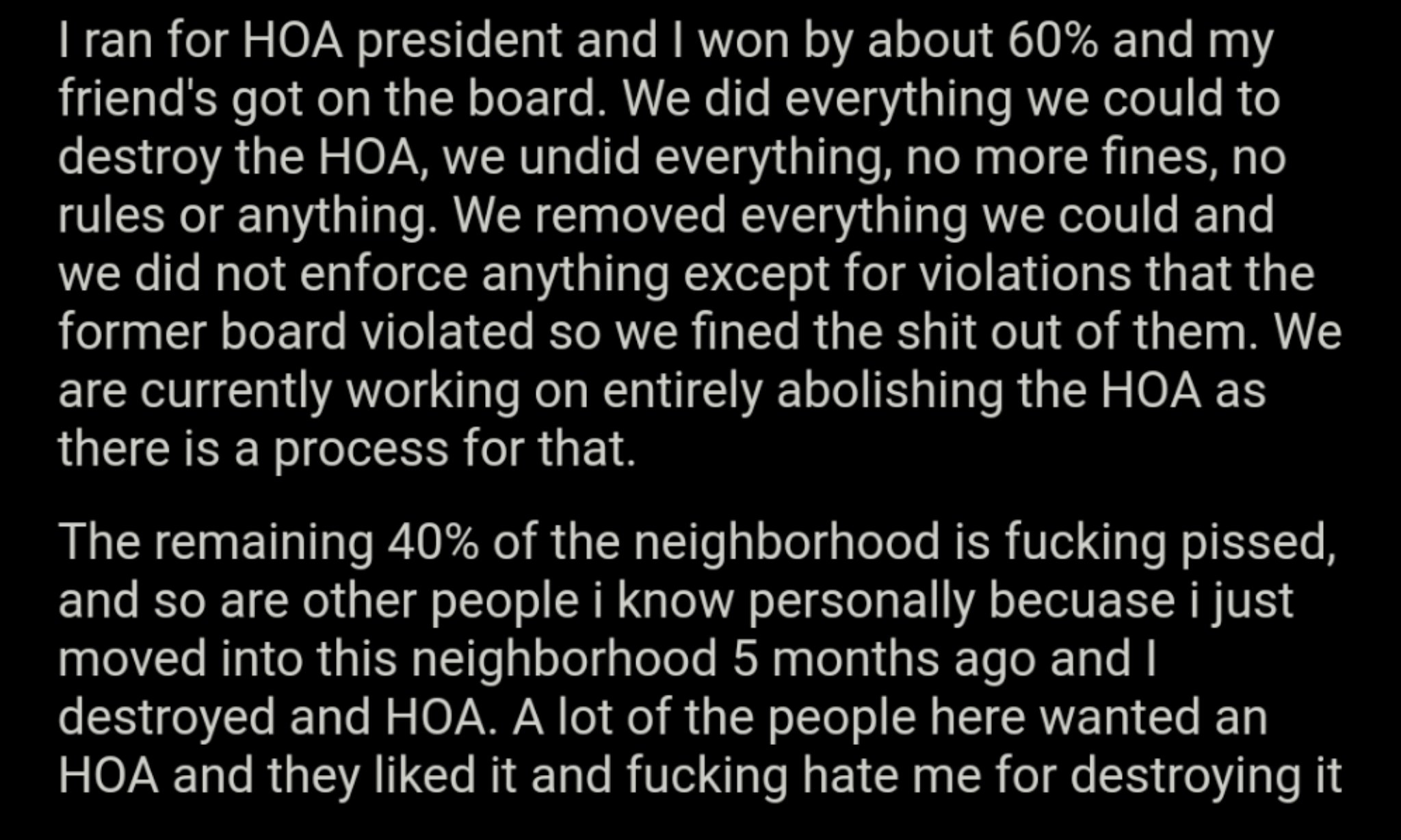 6. Deze persoon had een probleem met de Home Owner’s Association van zijn woning. De HOA dient als bestuur van woningen, om bepaalde regels door te voeren.