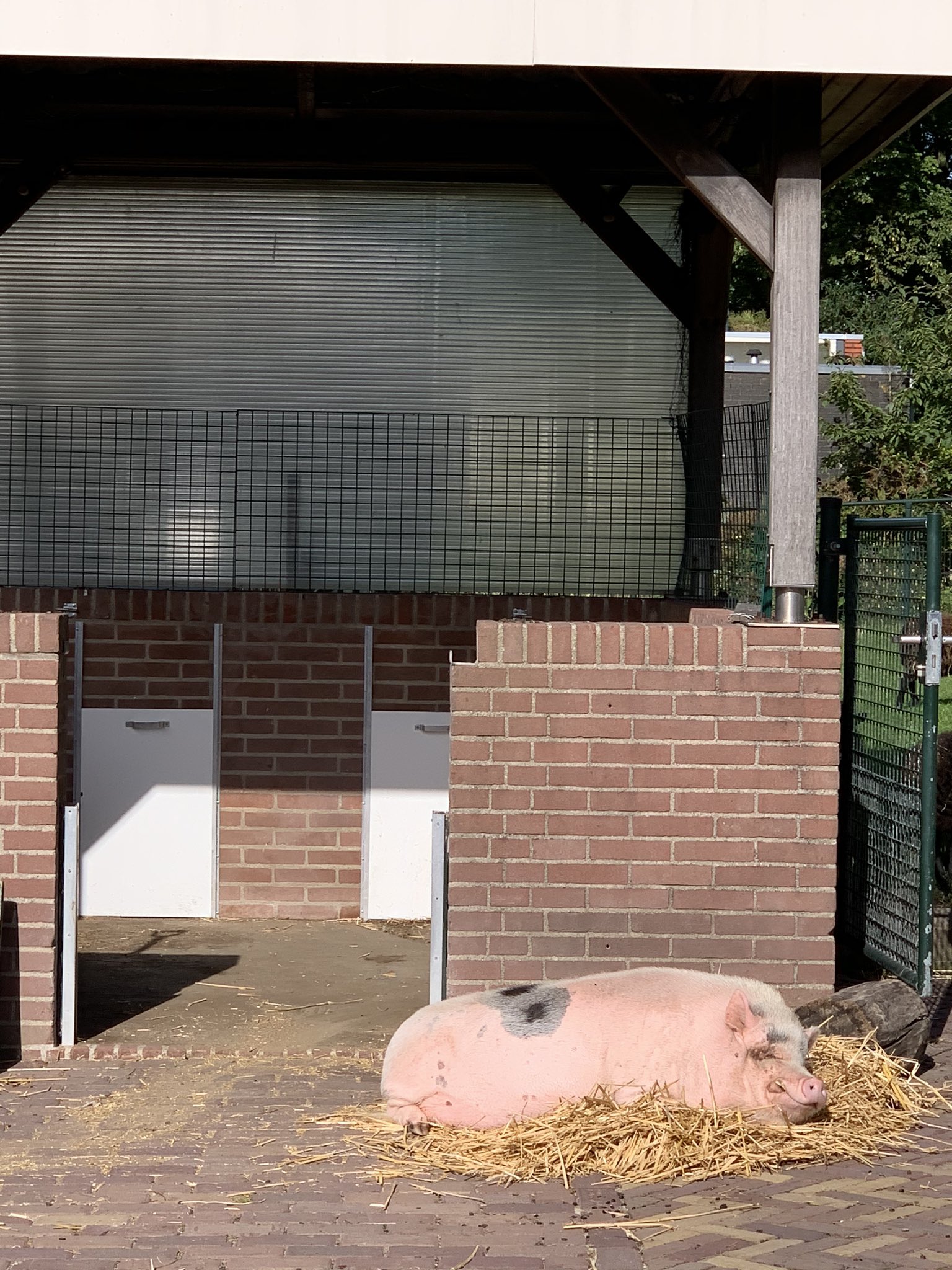 (5/8) Hij blokkeert regelmatig voor bezoekers (en ons) de hekjes naar het dierenpleintje door er voor te gaan liggen. Het ding is, je kunt een varken gewoon echt niet iets tegen z’n zin in laten doen. Dus dan sta je 5 min bij een varken van 300kilo te lobbyen dat ie weg moet.