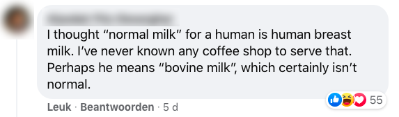 5. Het café deelde het tafereel rondom de review op Facebook en daar stroomden de reacties binnen. Want ook hier krijgt de klant nog even de volle laag over de definitie van ‘normale melk’.