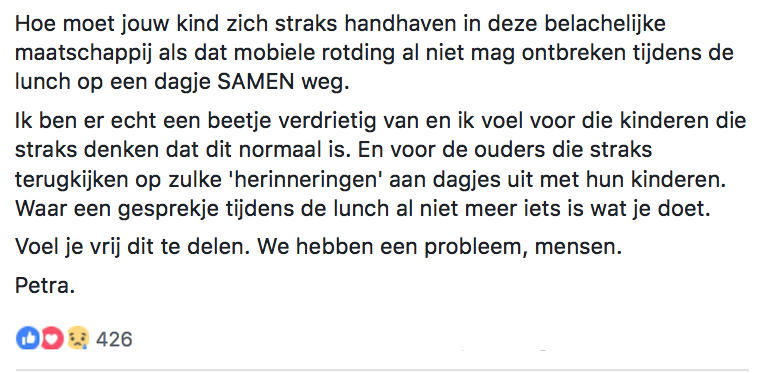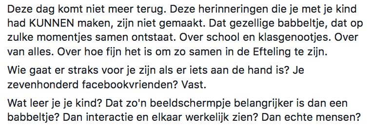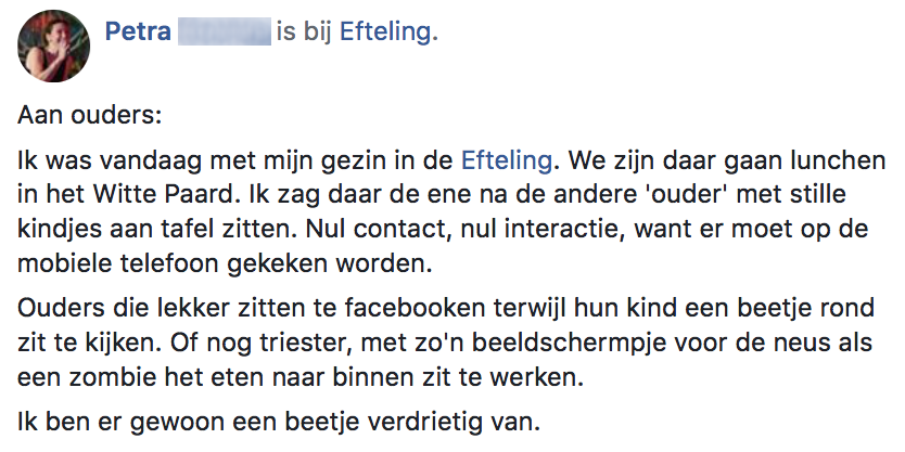 De Efteling is inmiddels weer open en mag dus bezoekers ontvangen. En dat de Efteling een paradijs is voor kinderen, dat is net zo’n understatement als dat Gijs bol en hol is. Petra ging ooit gezellig een dagje naar de Efteling, toen ze iets opmerkte bij veel kinderen in het park. Op Facebook deelt ze haar frustraties en verdriet, in de hoop de ogen van anderen te openen voor het groeiende probleem waar ze tegen stuitte. En ondanks dat dit bericht wat ouder is, is het onderwerp en haar boodschap absoluut niet minder relevant geworden.