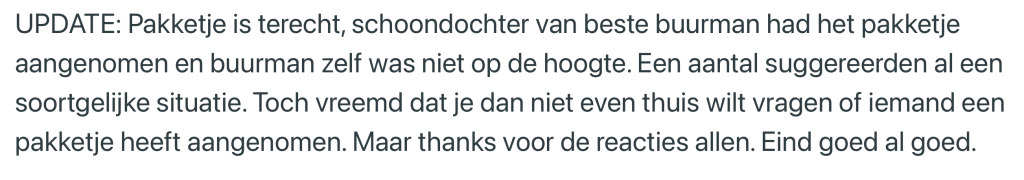 11. Maar eind goed, al goed: het mysterie rond het verdwenen pakketje is opgelost.