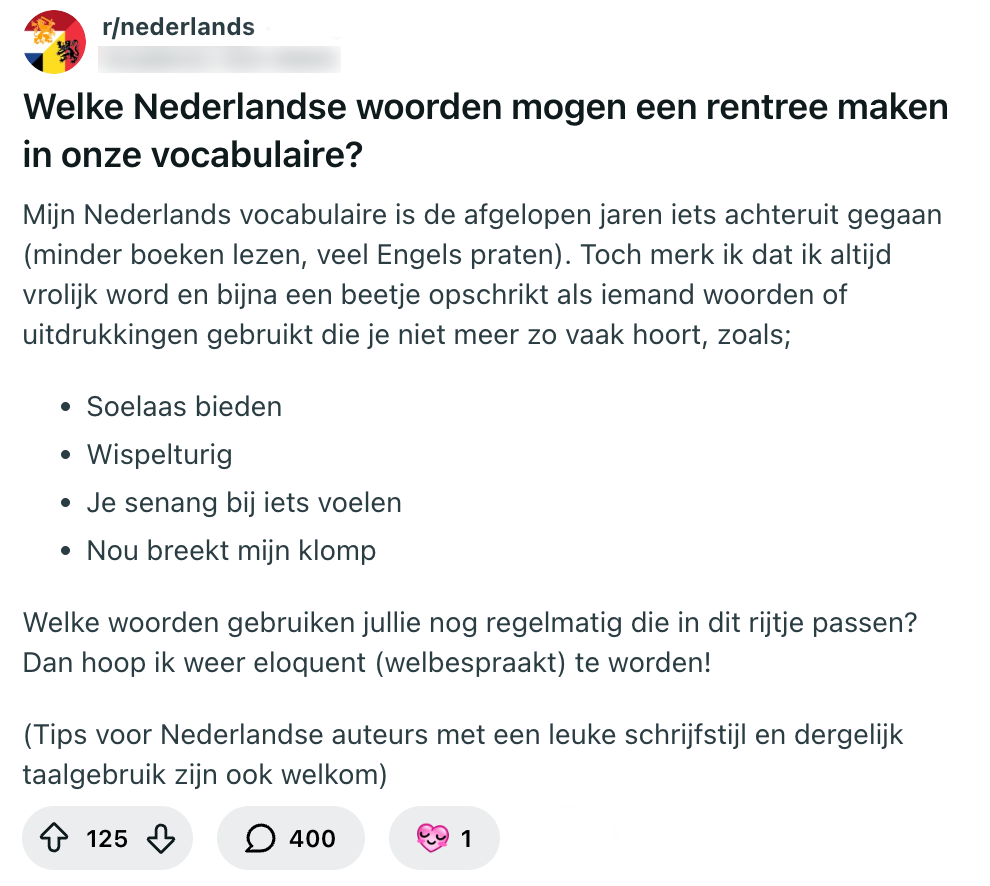 1. Deze Reddit-gebruiker zal zich pas echt senang voelen zodra deze woorden weer deel uitmaken van de woordenschat van de gemiddelde Nederlander.