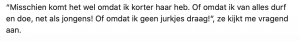 1. Michiel heeft het met zijn dochter over het verhaal van Frédérique, die in elkaar geslagen werd nadat ze meermaals de vraag ‘ben je een jongen of een meisje?’ toegeroepen kreeg.