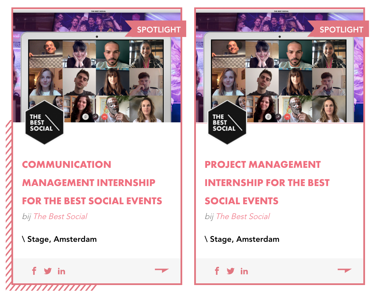 – Over stages gesproken, wij hebben twee prachtige stages in de baanbieding! Mits je lekker gaat op events dan. We zoeken namelijk een stagiaire communicatie management én een stagiaire project management voor The Best Social Events! –