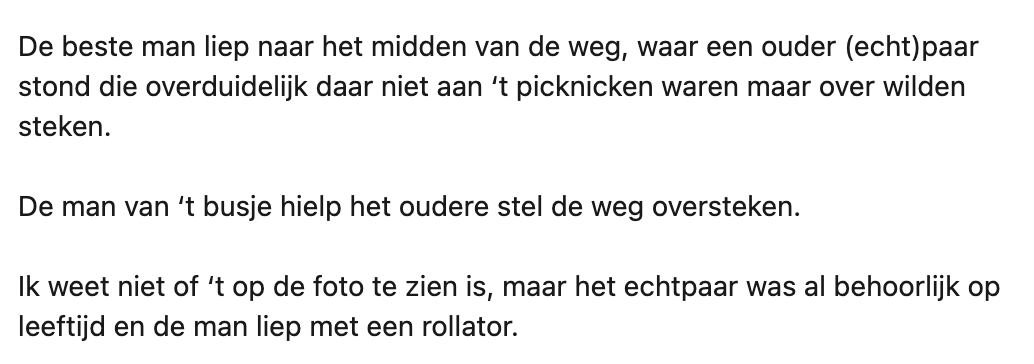 2. Een man stapt uit z’n busje en helpt een ouder echtpaar een eindje op weg.
