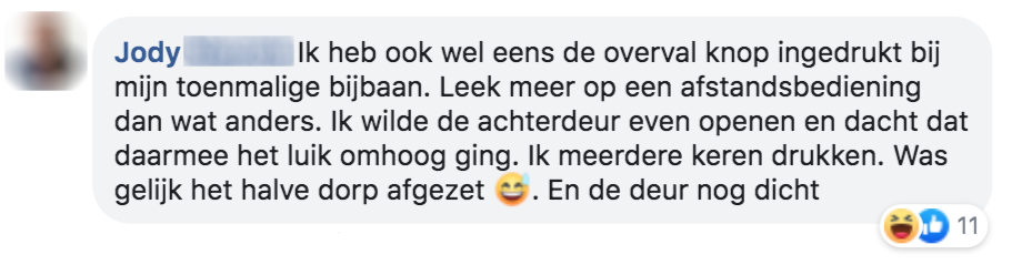 Ik heb ooit bij Trekpleister gewerkt en per ongeluk op de overval-knop geduwd. Ik had opeens een paar agenten aan mijn kassa.
