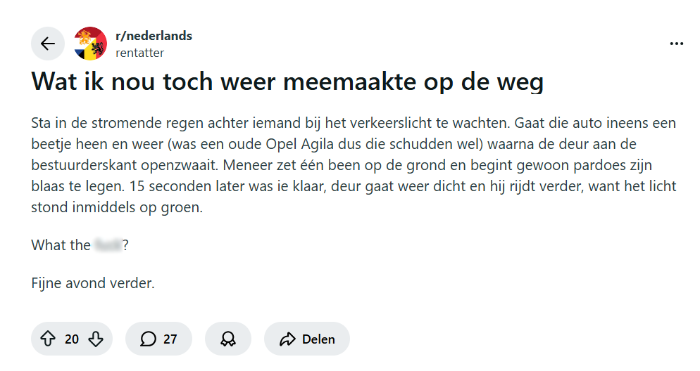 Of het nou een korte of lange rit zijn: moeten plassen in de auto is nooit fijn. De meeste mensen racen bij hoge nood met een topsnelheid naar het dichtstbijzijnde tankstation, maar het kan blijkbaar ook anders. En asocialer. Een Reddit-gebruiker ziet een automobilist een erg bizarre tactiek toepassen, en wordt daar (niet geheel onterecht) pissig van.