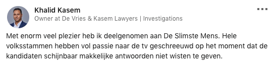 Ruim 1,7 miljoen mensen keken naar de finale van De Slimste Mens en zagen hoe journalist Marieke van de Zilver nog net van advocaat Khalid Kasem won. Maar verliezen? Dat deed niemand, zo blijkt uit de mooie post van Khalid.