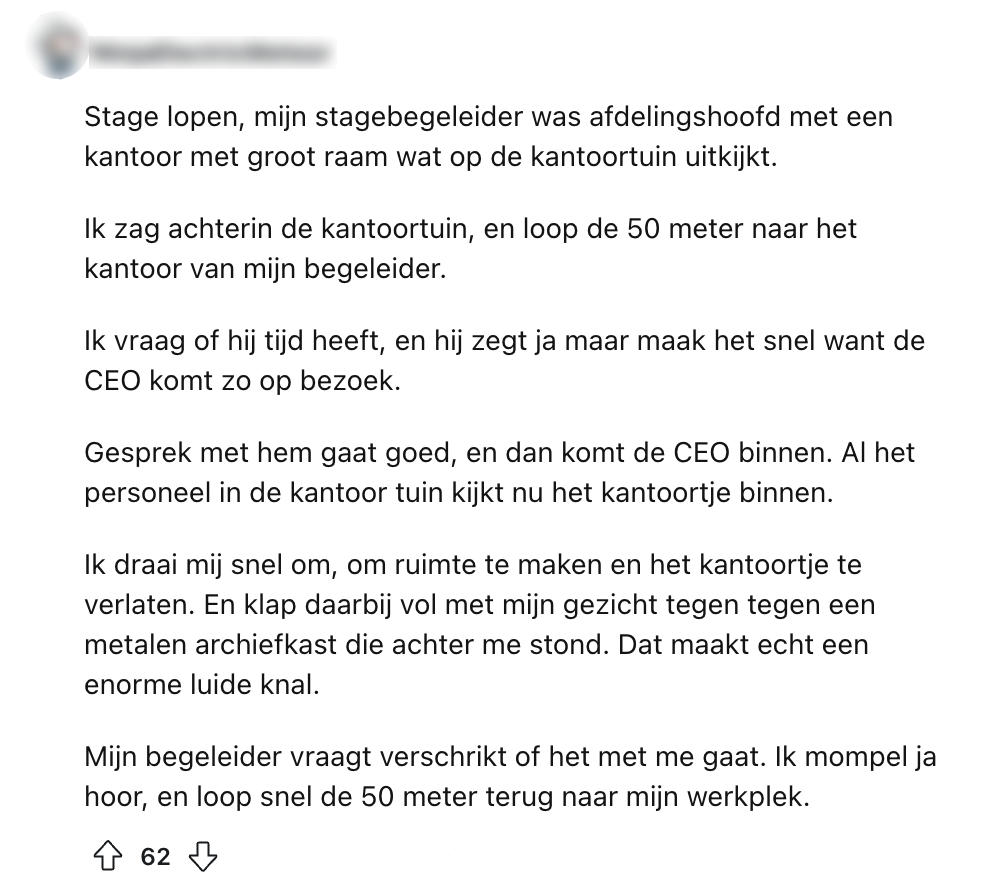 Je herkent het vast wel: je ligt lekker in je bed en bent helemaal klaar om te gaan slapen, maar je brein wilt nog even terugkijken op de meest vernederende momenten van je hele leven. Gelukkig zit er een bed tussen, want anders zou je recht door de grond zakken. Al ben je volledig op je plaat gegaan of heb je een net iets te harde scheet in het ov gelaten, voor schut staan is geen pretje. Om het leed te verzachten vraagt deze Reddit-gebruiker naar de meest vernederende momenten van andere Nederlanders en zij reageren met hilarische blunders.