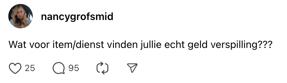 Dat het geld ons niet op de rug groeit, weten Nederlanders maar al te goed. Daarom zijn veel mensen extra bewust van hun uitgaven en sturen sommige gierige Gerda’s zelfs Tikkies van vijftig cent voor een slok water. Overdrijven is ook een vak, zullen we maar zeggen. Nancy is precies om deze reden erg benieuwd naar welke uitgaven Nederlanders nou écht geldverspilling vinden, en daarmee scheurt ze onbedoeld een beerput van hier tot Tokio open.