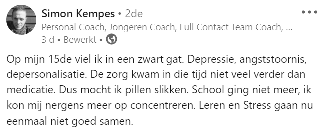 Op zijn vijftiende belandde Simon in een zwart gat. Hij had moeite met school, werd depressief en bracht veel tijd op straat door. Deze nare periode duurde maar liefst twee jaar lang. Toen hij zeventien was maakte zijn leven een behoorlijke draai en maakte hij een grote reis. Dit avontuur heeft zijn leven gered en dat maakt een hoop indruk op LinkedIn.