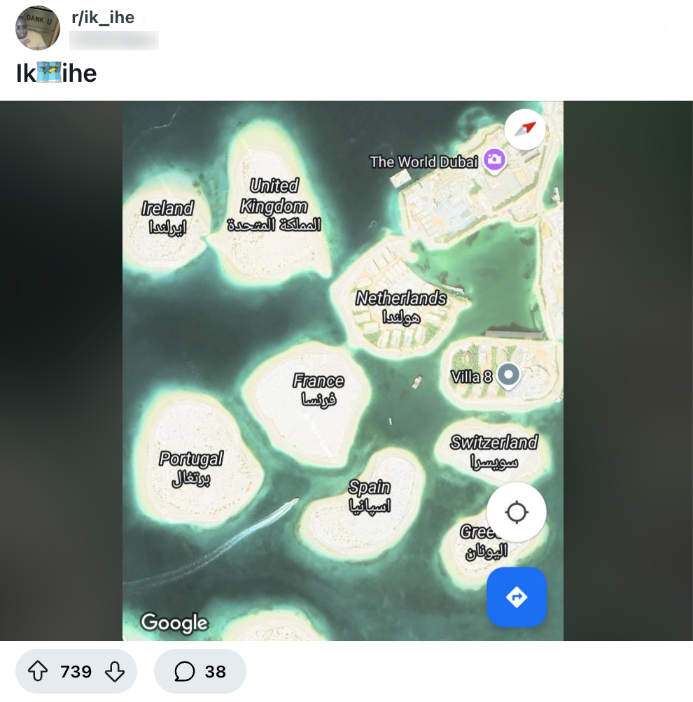 Op onze groene (lees: bruine en opwarmende) planeet zijn er ontelbaar veel dorpen en steden. Te veel om allemaal uit je hoofd te leren. Toch maken deze eilanden het een tikkeltje makkelijker. Deze Reddit-gebruiker stuit namelijk op een kaart van de eilanden van Dubai, die nogal bekende namen hebben. Dit roept heel wat vraagtekens op bij Nederlanders.
