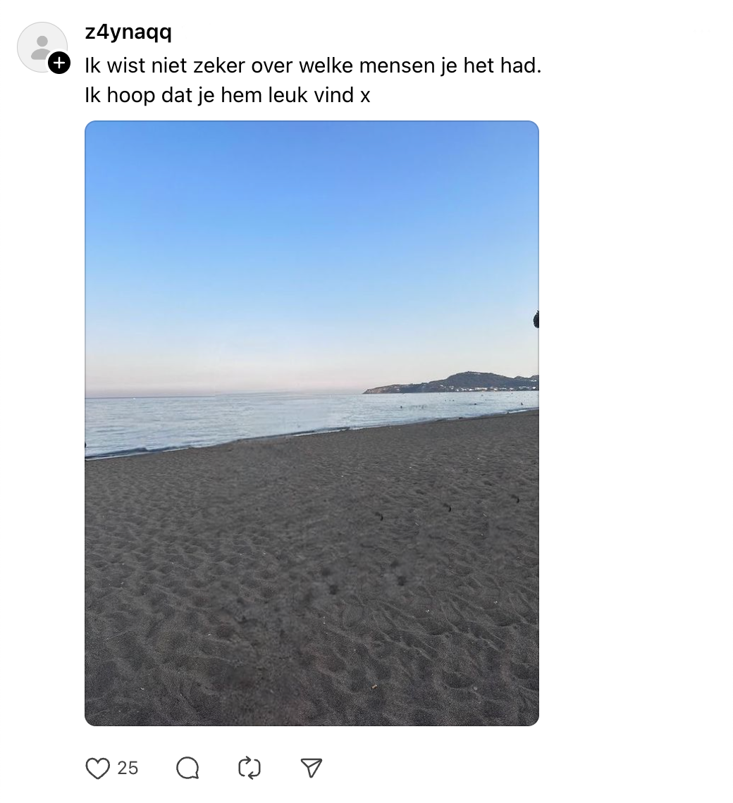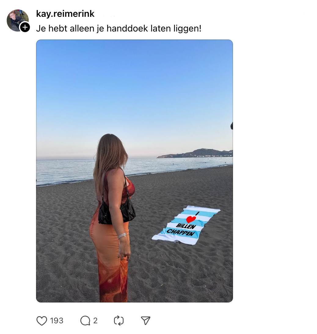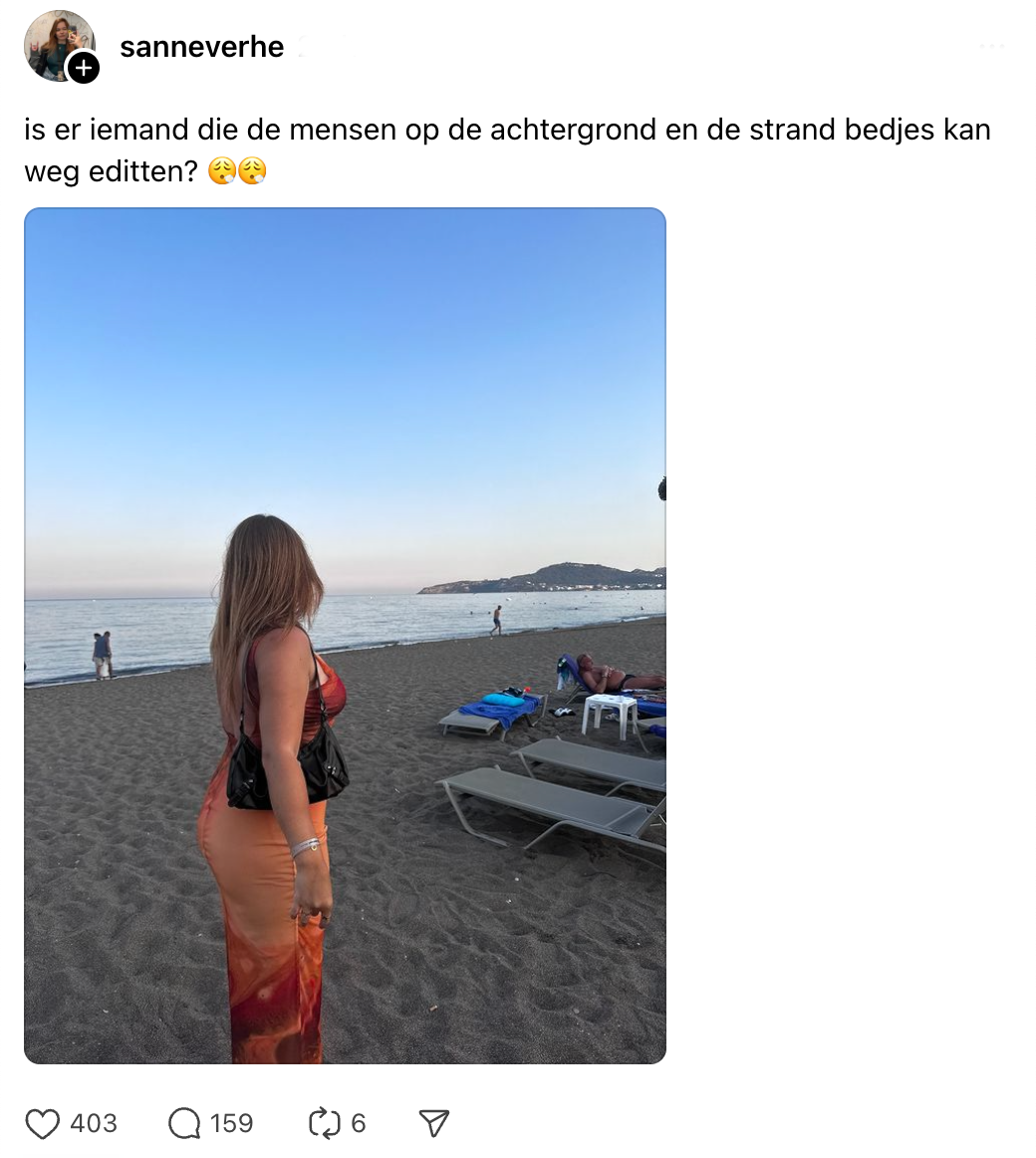 Leuke foto’s maken voor je socials kan af en toe best een opgave zijn. Je wil natuurlijk dat jouw post er goed en origineel uitziet zodat-ie er echt uitspringt. Op vakantie kan je meer dan genoeg inspiratie opdoen: prachtige stranden, talloze feestjes of heerlijke lokale hapjes. Ook Sanne heeft wat kiekjes gemaakt tijdens haar vakantie, maar loopt tegen één probleem aan. Ze vraagt online of iemand haar kan helpen met photoshoppen en andere Threads-gebruikers gaan op creatieve wijze aan de haal met Sannes vakantiefoto.