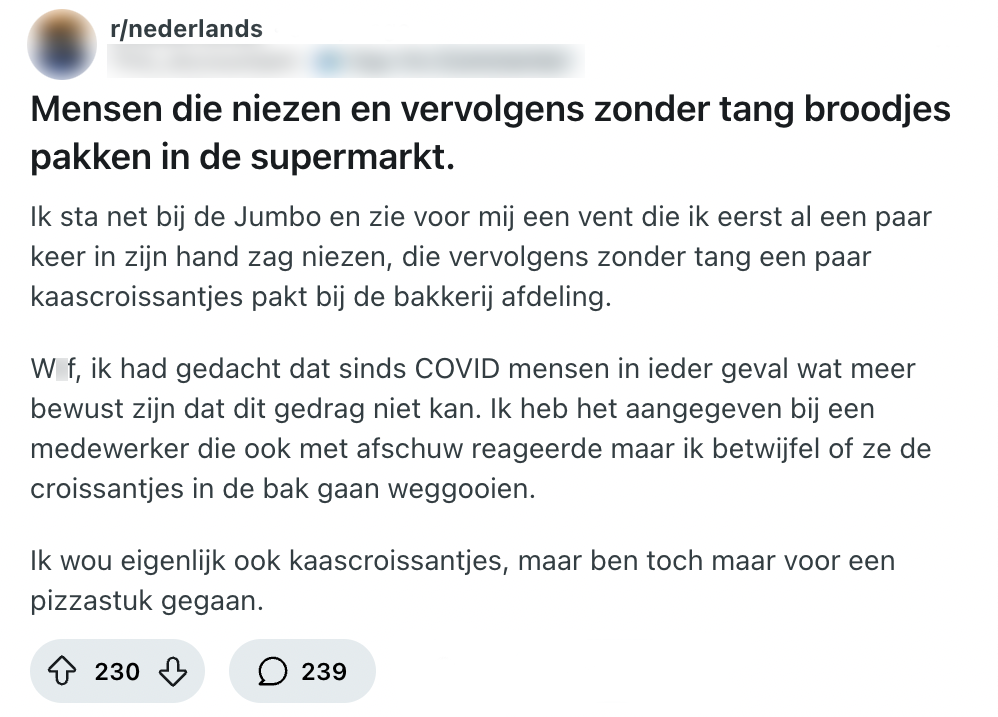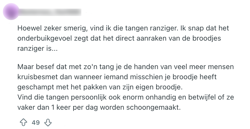 In de supermarkt moet je onwijs veel keuzes maken. Denk bijvoorbeeld aan de keuze tussen een winkelwagen en een mandje of het uitkiezen van een kleine tegenslag waardoor jij wel een sweet treat hebt verdiend. Ook op de broodafdeling sta je voor een lastig dilemma: ga je dat lauwe broodje met de tang of je eigen tengels pakken? Nadat een Reddit-gebruiker een opmerkelijke situatie op de broodafdeling van de Jumbo ziet, komen er toch wat verontrustende vragen naar boven. In de reacties wordt er een aardige discussie aangewakkerd en andere klanten zijn het maar niet eens over wat een betere keuze zou zijn.