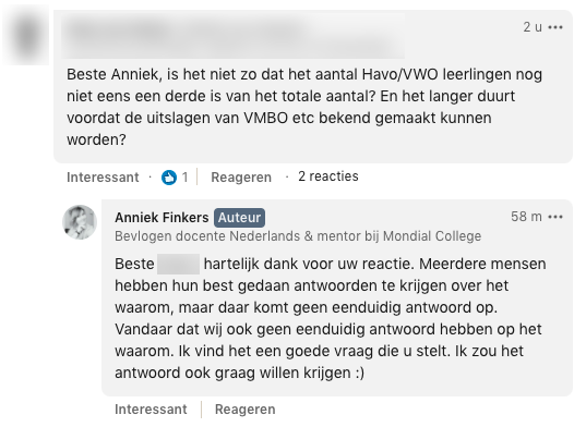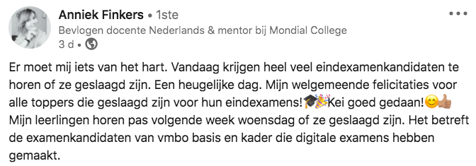 1. Onlangs plaatste Anniek dit bericht op LinkedIn. Ze begint haar boodschap over de uitslag van de eindexamenkandidaten.