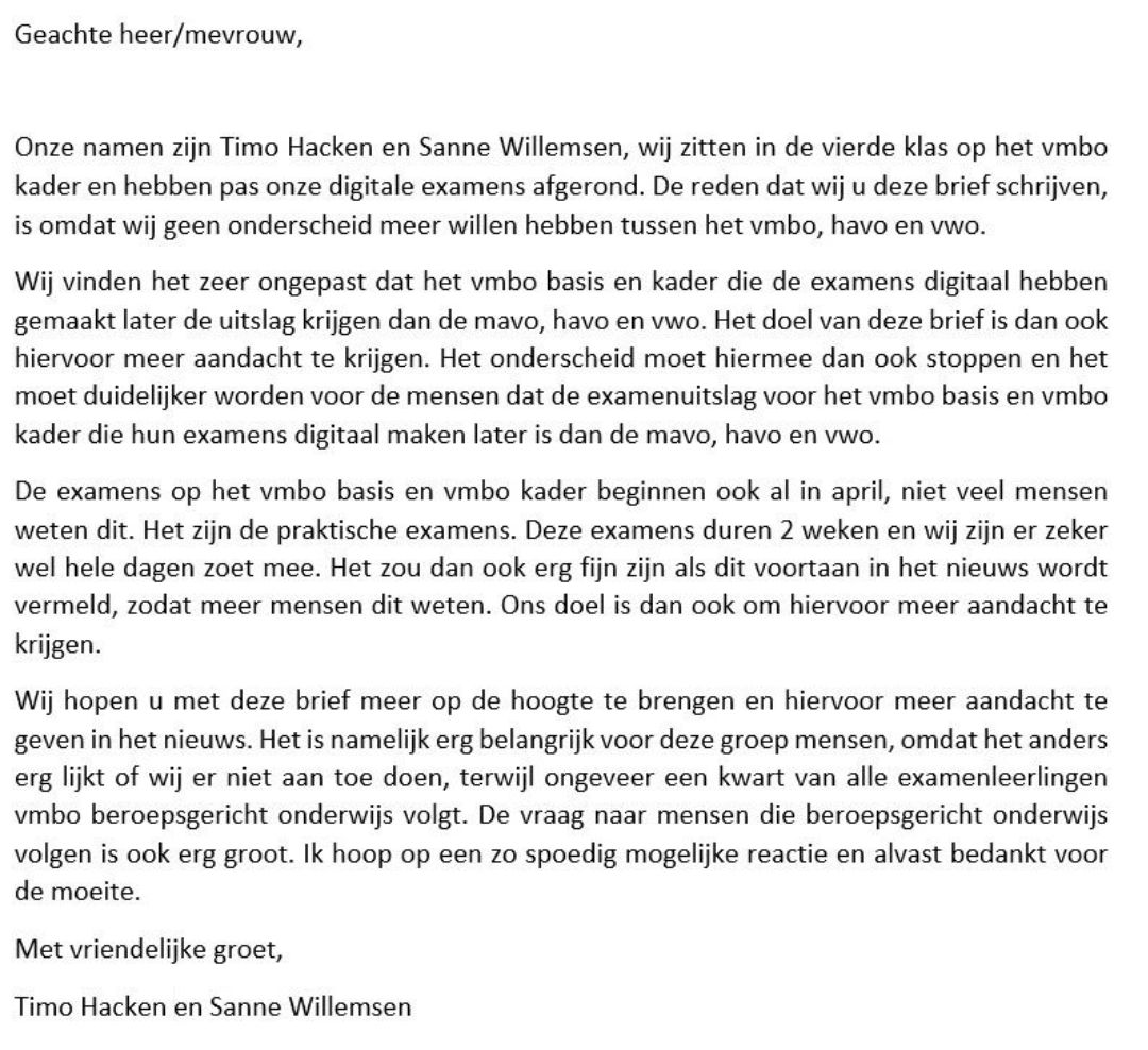 6. Anniek deelt de brief die Timo en Sanne schreven naar de NOS, met de insteek om hier meer aandacht voor te krijgen.