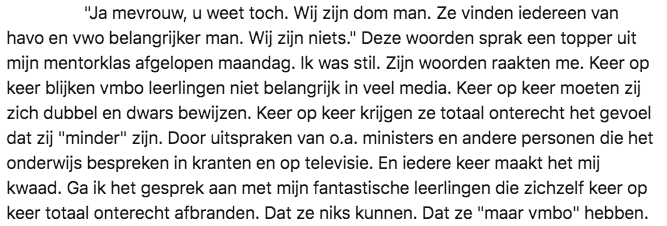 2. De woorden van één van haar mentorleerlingen raakte haar enorm. Haar leerlingen, waar ze zo ontzettend trots op is, voelen zich ”minder” dan bijvoorbeeld havo en vwo-leerlingen.