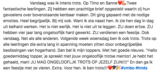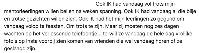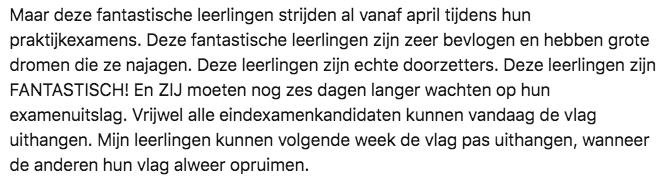 3. Vol trots vervolgt ze haar bericht over haar leerlingen die echte doorzetters blijken te zijn, maar die wel een week later op hun examenuitslag moeten wachten.