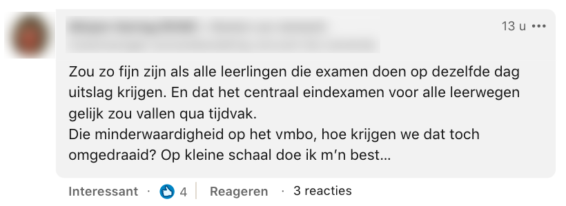 Afgelopen week hebben veel eindexamenkandidaten te horen gekregen of ze geslaagd waren. Helaas gold dat niet meteen voor de examenkandidaten van vmbo basis en kader, die digitale examens gemaakt hebben. Zij krijgen namelijk deze week pas de uitslag. En dat zit Anniek, docente van het Mondial College Meeuwse Acker in Nijmegen, niet lekker. Want waarom krijgen vmbo-leerlingen pas de uitslag wanneer de andere leerlingen hun vlag al bijna weer opbergen? Dat verdient meer aandacht, vindt Anniek. Ze wijdt er een bericht aan op LinkedIn en mensen staan haar bij in de comments.