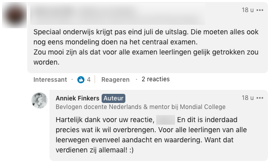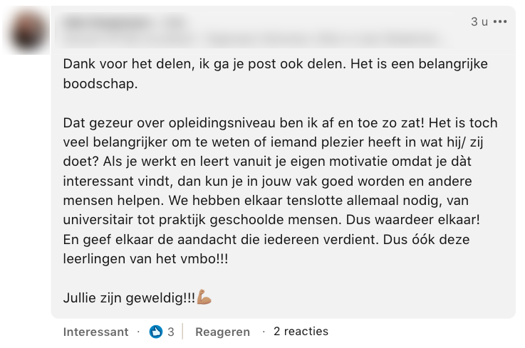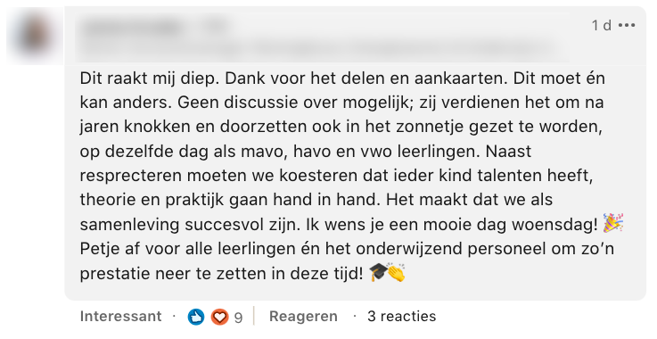 10. Tot slot zijn velen in de comments het er over eens dat alle leerlingen en studenten op alle niveaus even veel waardering en aandacht verdienen. ”Dat is de boodschap die wij willen uitdragen. Een belangrijke!”, sluit Anniek af.