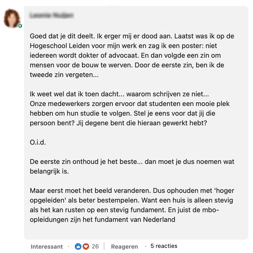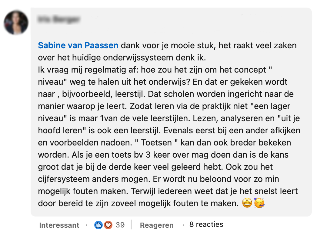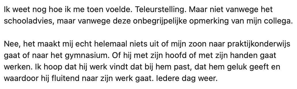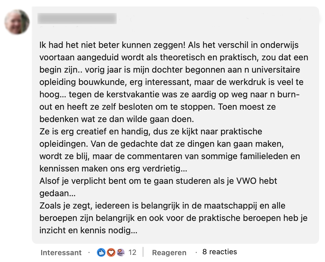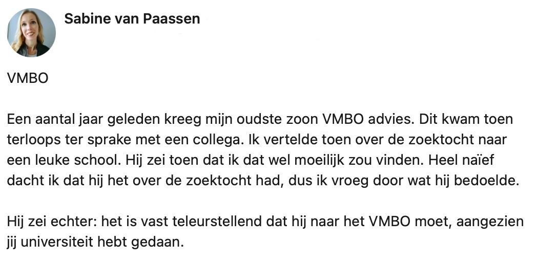 Voor veel groep-achters is het nog steeds spannend welk advies ze meekrijgen van hun basisschool. Toen advocate Sabine het VMBO-advies van haar zoon deelde met een collega, ging hij er vanuit dat zij als ouder hier wel moeite mee zou hebben. Ze maakt op LinkedIn duidelijk dat niets minder waar is en dat het allerbelangrijkste is dat haar kind blij wordt van wat hij doet, of dat nu op VWO- of op VMBO-niveau is. Veel mensen reageren instemmend met dit bericht en vinden überhaupt dat er vooral op de kwaliteiten van het kind gefocust moet worden in plaats van op het schoolniveau.