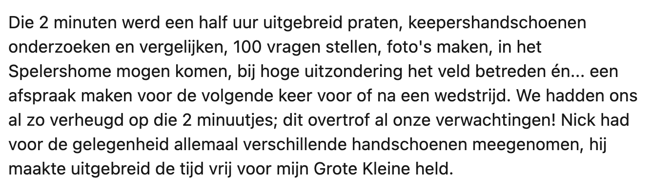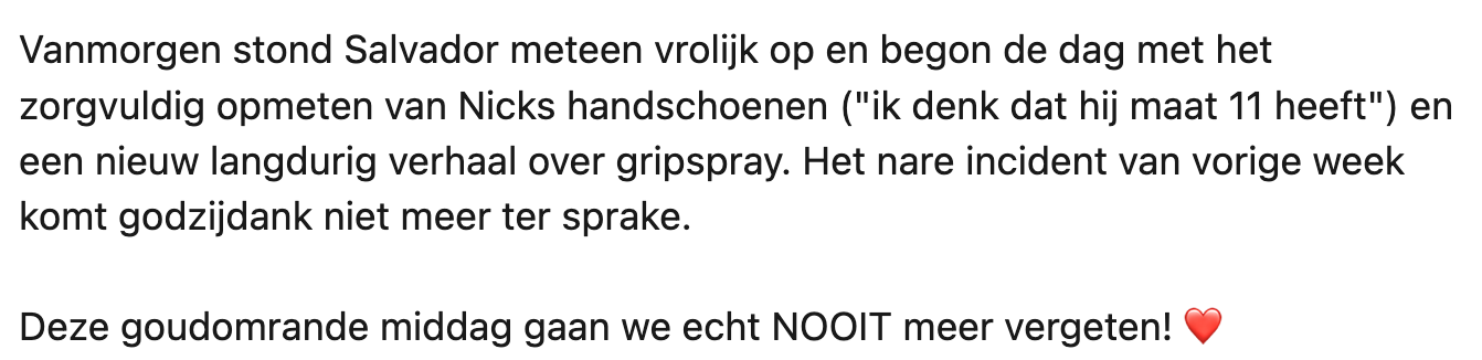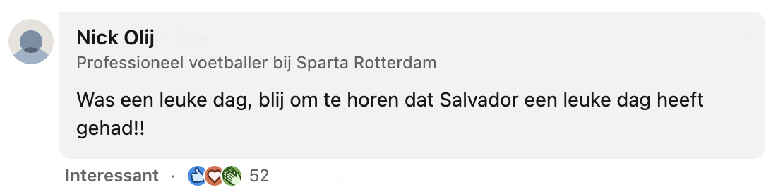 Wanneer Salvador iets heftigs meemaakt, besluit zijn moeder Eveline hem op te vrolijken. En dat doet ze niet met een zak snoep of een reep chocolade, maar door een poging te doen om zijn allergrootste droom uit te laten komen: een ontmoeting met Sparta-keeper Nick Olij. Eveline stuurt de voetbalclub op hoop van zegen een berichtje en krijgt binnen no time reactie. Het resultaat? Eveline blij, Salvador blij én keeper Nick blij.