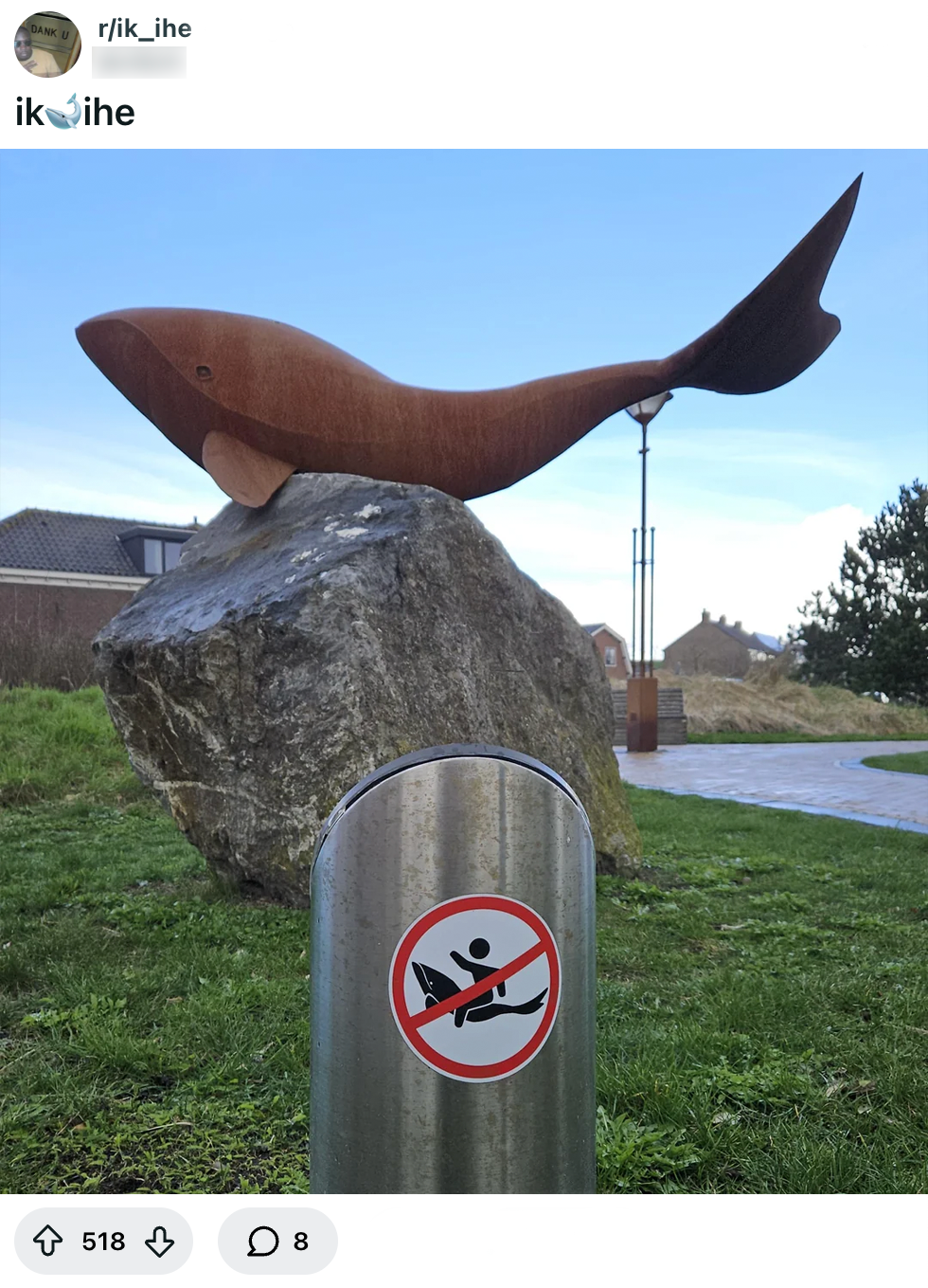 Verbodsborden zijn over het algemeen geen overbodige luxe. Het is namelijk ook wel logisch dat je niet je fiets voor een nooduitgang mag parkeren of condooms in de winkelwagen van ouders van irritante kinderen mag gooien. Maar in dit geval is het vooral erg jammer dat er een verbod geldt. Deze Reddit-gebruiker loopt namelijk voorbij een standbeeld van een walvis wanneer die plots een bord spot. Het verbod dat erop staat komt nogal hard aan.