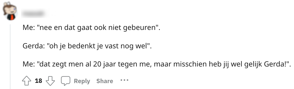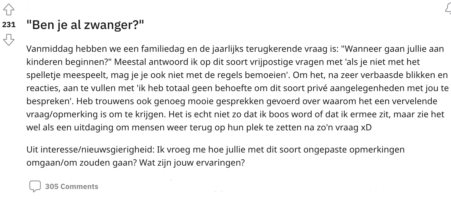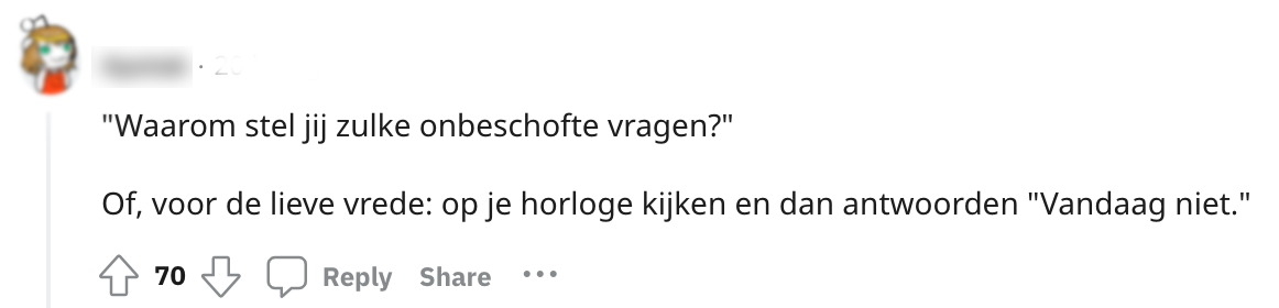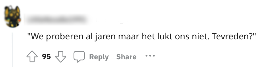 Voor veel mensen gaat een familiegelegenheid gepaard met vragenvuur vol ongepaste nieuwsgierigheid. Zoals: “Wanneer krijg je nou eens een partner?” En als je dan een liefde gevonden hebt, wordt het al snel: “Wanneer krijgen jullie nou eens kinderen?” Deze Redditor vroeg zich af wat je nou moet reageren op zo’n ongepaste vraag. De meest scherpe en een tikkeltje harde comebacks worden opgegooid zodat de mond van die bemoeizuchtige tante even wordt gesnoerd.