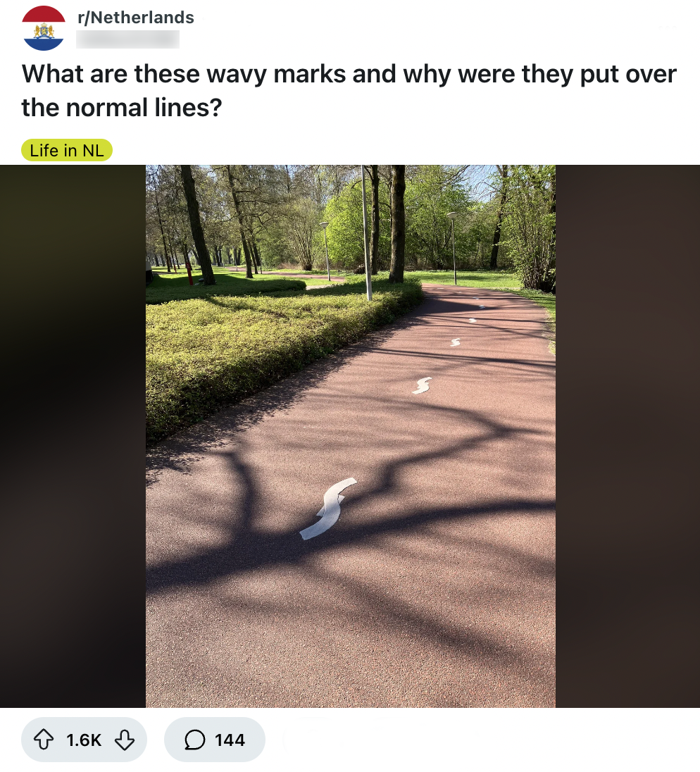 Fietsen zit in ons bloed. Zodra jij als klein kind leert te fietsen, gaat er een wereld van rood asfalt, witte lijnen en rotondes voor je open. Ineens kan je naar elke locatie fietsen die je hartje maar begeert. Maar niet elk fietspad is hetzelfde. Zo ontdekt deze Reddit-gebruiker een weg met gekronkelde, in plaats van rechte lijnen, en vraagt voor een verklaring. Die vraag levert een aantal dubieuze antwoorden op.