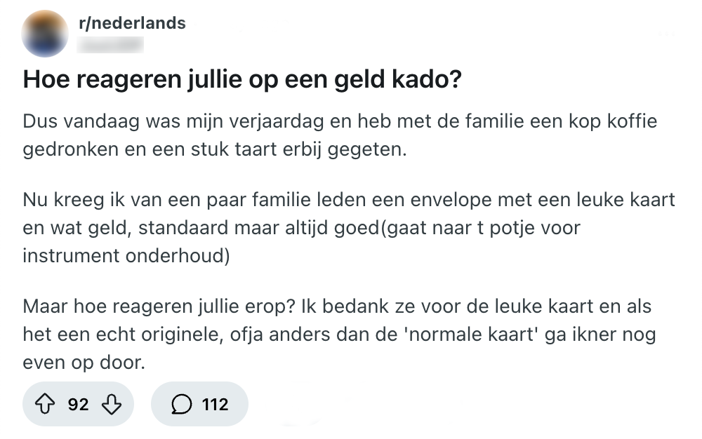 Elk jaar weer. Stoelen in een kring, een bord met blokjes kaas en leverworst dat rondgaat en het koffiezetapparaat dat in de keuken al sinds tien uur ’s ochtends overuren draait. Dat kan maar één ding betekenen: je verjaardag. Daar horen natuurlijk ook cadeaus bij, maar het kan soms knap lastig zijn om op een gepaste manier daar op te reageren. Een Reddit-gebruiker vraagt zich af hoe andere Nederlanders reageren op een kaart met geld op hun verjaardag en krijgt talloze reacties.