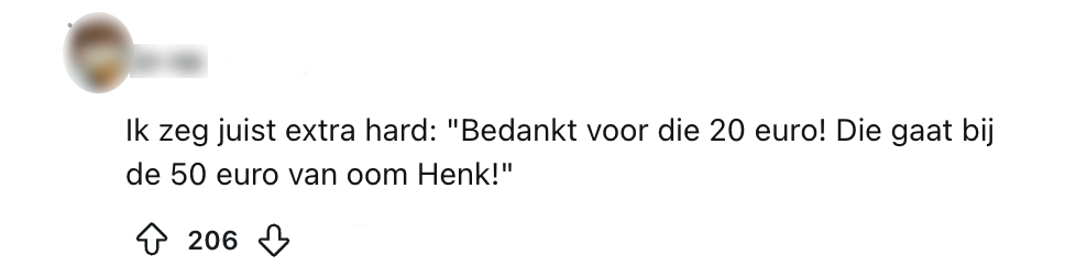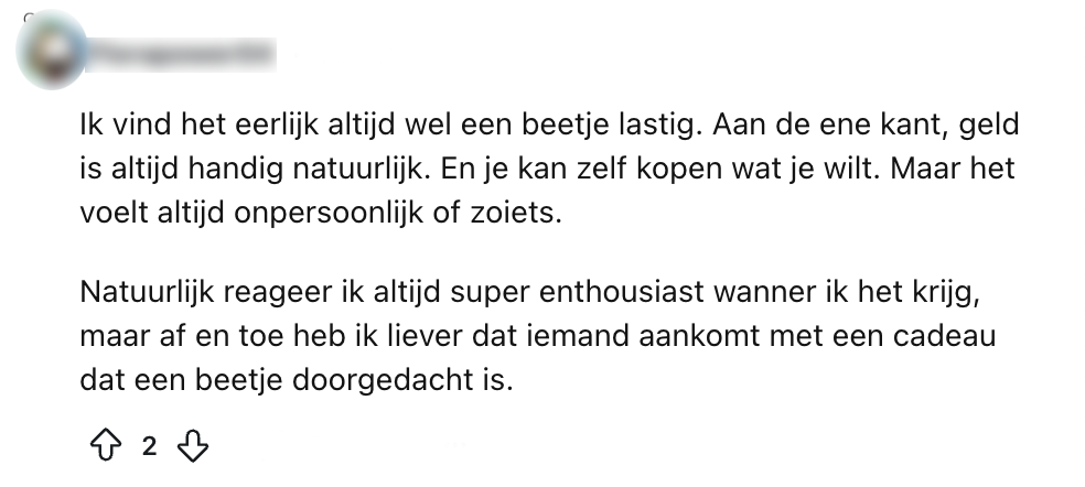 Elk jaar weer. Stoelen in een kring, een bord met blokjes kaas en leverworst dat rondgaat en het koffiezetapparaat dat in de keuken al sinds tien uur ’s ochtends overuren draait. Dat kan maar één ding betekenen: je verjaardag. Daar horen natuurlijk ook cadeaus bij, maar het kan soms knap lastig zijn om op een gepaste manier daar op te reageren. Een Reddit-gebruiker vraagt zich af hoe andere Nederlanders reageren op een kaart met geld op hun verjaardag en krijgt talloze reacties.
