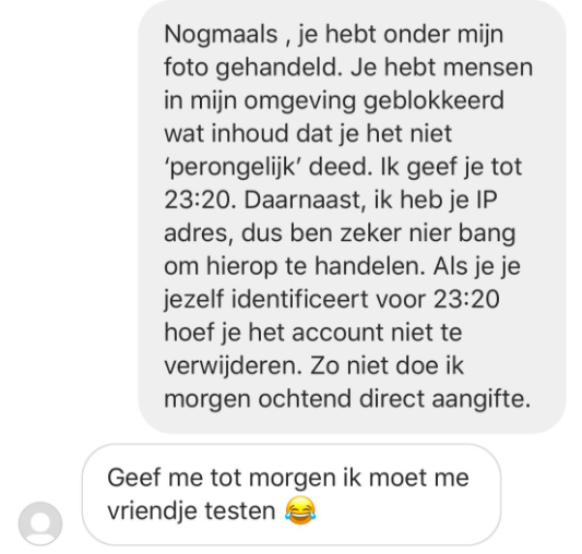 Hahahaha dusss ik zei nog 1x dat als ze gewoon vertelde wie ze was ze het account mocht houden, ze was verstandig genoeg mijn foto’s van het account te verwijderen maar ik wilde eig dat het acc helemaal weg ging maarja she didnt delete it