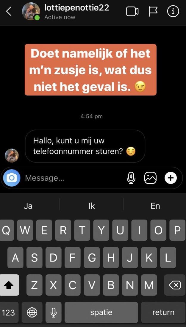 2. Vervolgens gaat het nep-profiel allemaal mensen volgen die jij volgt, in de hoop terug gevolgd te worden. Ze sturen daarna een DM met de vraag of ze je telefoonnummer mogen. (Overigens is bovenstaand nepprofiel alweer verwijderd. Gelukkig had de persoon in kwestie het op tijd door)