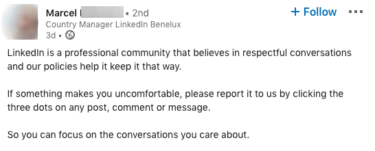10. Overigens kun je mensen op LinkedIn ook gewoon rapporteren en blokkeren. En LinkedIn adviseert je dus om dit te doen als je verzoeken krijgt waar je niet van gediend bent.