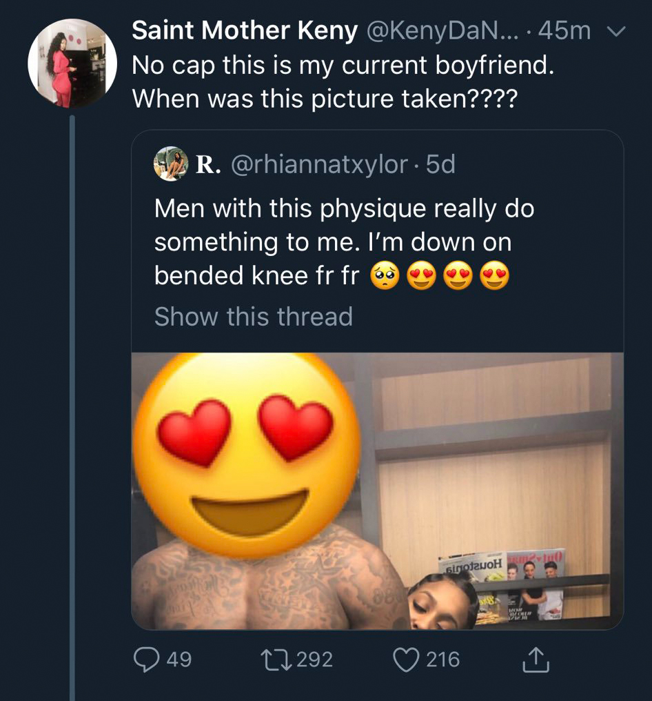 2. Veel mannen plaatsen een foto van hun eigen lichaam onder de tweet. En dan is daar ineens een Twitteraar (waarvan het account inmiddels is verwijderd) die zegt: dit is mijn vriend waar komt deze foto vandaan?